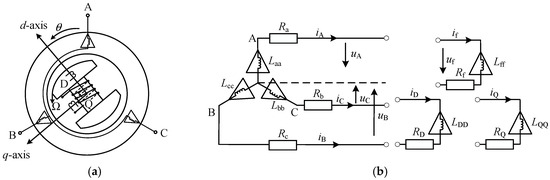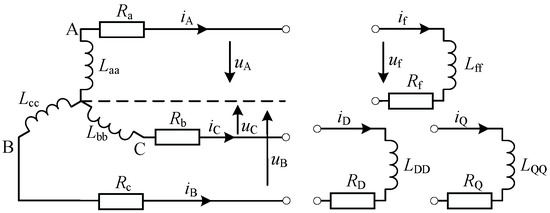 In the derivation process presented in this paper, the synchronous generator is assumed to be an ideal machine characterized by a salient-pole rotor structure. Furthermore, unless explicitly stated otherwise, it is assumed that D (d-axis) and Q (q-axis) damping windings are present on the rotor, in addition to the field winding. The structure of the synchronous generator in the ABC coordinate system is shown in Figure 2.