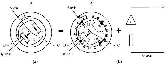 The meaning of dq0 transformation. (a) ABC coordinate system. (b) A dq coordinate system rotating with the rotor and an isolated 0-axis system.