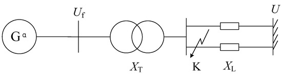 In Figure 6, is the fractional-order synchronous generator, is the terminal voltage of the synchronous generator, is the transformer reactance, K is the fault point, is the line reactance, and U is the infinite bus voltage.