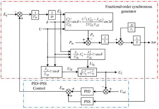 where is the total equivalent reactance of the transformer and transmission line, , and . Based on expressions (33) and (34), the following fractional-order synchronous generator control strategy can be obtained (Figure 7).