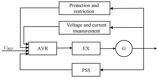 Schematic diagram of the excitation control system functions. —reference voltage; EX—exciter; G—synchronous generator.