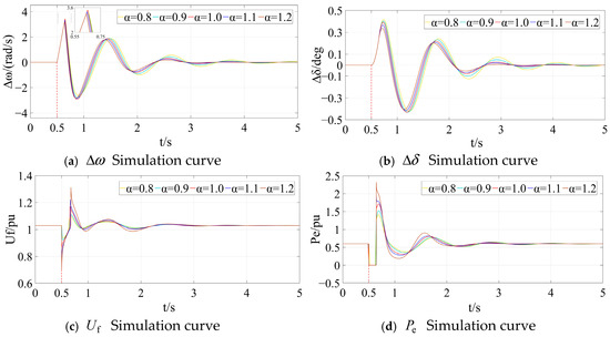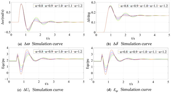 This condition involves a disturbance with an input mechanical power of . The initial value of the input mechanical power is 0.6, and the final value is 0.8, with the disturbance occurring at 0.5 s. The inductance order of the fractional-order synchronous generator 2 + α model is set sequentially to 0.8, 0.9, 1.0, 1.1, and 1.2. The response process curves of the system’s state variables , , , and are shown in Figure 9a–d.