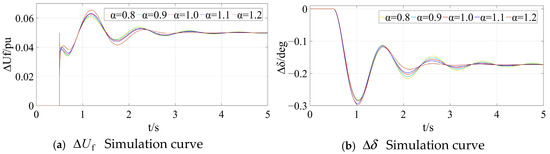 This condition involves a disturbance in the excitation regulator reference voltage . The initial value of the terminal voltage is 1.0293, and the final value is 1.0793, with the disturbance occurring at 0.5 s. The inductance order of the fractional-order synchronous generator 2 + α model is sequentially set to 0.8, 0.9, 1.0, 1.1, and 1.2. The response process curves of the system’s relevant state variables and are shown in Figure 10a,b.