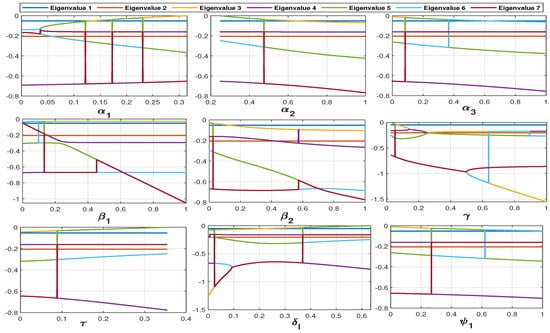 As we know, a system is said to be locally asymptotically stable at equilibrium if all the eigenvalues are negative around this equilibrium point and unstable otherwise. We obtain the following eigenvalues using Maple (version 7) software.