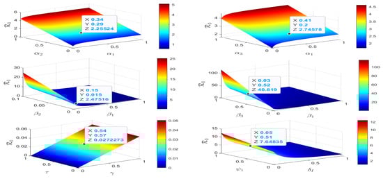 Thus, the basic reproduction number of the model (Equations (4)–(11)) is given as: