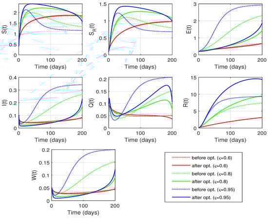 The populations of susceptible trees, , and resistant trees, , both increase after optimization. However, this increase is less pronounced compared to the case. The number of exposed trees, , and the number of infected trees, , decrease following optimization, highlighting the effectiveness of quarantine in preventing exposed trees from progressing to infection. Additionally, the treatment of infected trees reduces disease prevalence. However, compared to , the reduction is slightly less, suggesting that early isolation, as seen in the awareness campaign, is more effective in preventing exposure in the first place. This suggests that while quarantine and treatment measures are beneficial, they are not as effective in preventing initial exposure as awareness-based isolation. The number of quarantined trees, , and the recovered trees increase after optimization. The increase in the quarantined trees is more pronounced compared to previous cases, confirming that this strategy focuses on containing and treating infected trees rather than preventing infections outright. Water contamination decreases, though not as significantly as in the (irrigation water treatment) case.