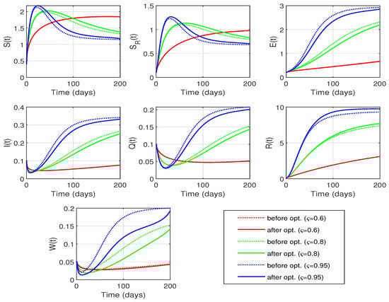 Case-3: Control of disease through quarantine and treatment alone: To examine the effect of quarantine and treatment control on the dynamics of the disease, we consider the control problem (43) with and , where we take equal to zero. Figure 13, Figure 14 and Figure 15 demonstrate the graphical illustration of Case-3.