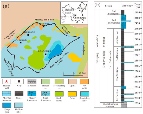 (a) Sedimentary environment of the Sichuan Basin during Dongyuemiao Member deposition (modified from [37,38]). (b) Stratigraphic column of the Jurassic Dongyuemiao Member.