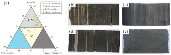 (a) Ternary lithofacies diagram of the Jurassic Dongyuemiao Member lacustrine shale. (b) Shell–laminae mixed shale (SLMS). (c) Silty–laminae clay shale (SLCS). (d) Clast–laminae clay shale (CLCS). (e) Clay shale (CS). M: mixed shale, and CM: clay shale.