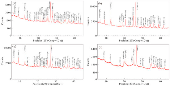 The total organic carbon (TOC) content of lacustrine shale in the Dongyuemiao Member ranges from 0.57% to 4.03%, with a measurement error of δ = ±5% and an average of 1.71% (Table 1), The primary minerals in lacustrine shale are quartz (10.2–30.6%, avg. 23.3%), with a measurement error of δ = ±15%, and clay minerals (25.4–66.8%, avg. 53.1%), with a measurement error of δ = ±10%, which together constitute 76.4% of the total mineral content. In this study, lacustrine shale samples are classified into four lithofacies types (Figure 2a): shell–laminae mixed shale (SLMS) (Figure 2b), silty–laminae clay shale (SLCS) (Figure 2c), clast–laminae clay shale (CLCS) (Figure 2d), and clay shale (CS) (Figure 2e). Among these, CS has the highest TOC content, averaging 2.19%, while SLCS has the lowest TOC content, averaging 1.31%. Using representative samples from four lithofacies for XRD patterns (Figure 3), testing X-ray diffraction (XRD) results reveal variations in mineral composition across the four lithofacies; SLCS has the highest clay content, averaging 64.15% (averaging 64.15%), while SLMS has the lowest (averaging 41.5%). CS has the highest quartz content (averaging 27.2%), whereas SLMS has the lowest (averaging 21.7%).