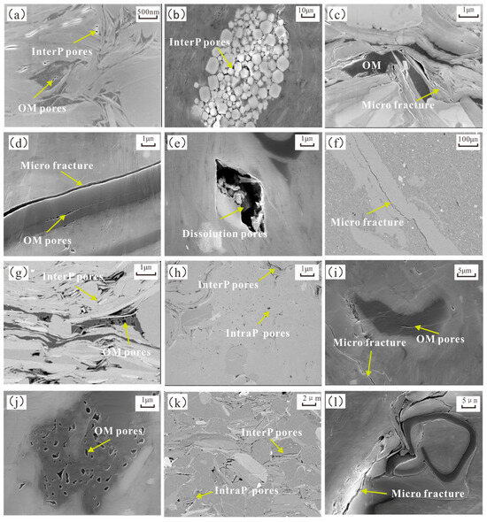 FE-SEM images of different lithofacies. (a) Inter-P pores and OM pores of sample Well A, 2937.66 m. (b) Inter-P pores of sample Well A, 2940.08 m. (c) Micro-fracture of sample Well A, 2940.08 m. (d) OM pores and micro-fracture of sample Well C, 2651.71 m. (e) Dissolution pores of sample Well B, 2498.7 m. (f) Micro-fractures of sample Well A, 2951.72 m. (g) Inter-P pores and OM pores of sample Well B, 2493.09 m. (h) Inter-P pores and Intra-P pores of sample Well B, 2494.22 m. (i) OM pores and micro-fractures of sample Well B, 2509.7 m. (j) OM pores of sample Well B, 2503.37 m. (k) Inter-P pores and Intra-P pores of sample Well A, 2944.06 m. (l) Micro-fracture of sample Well B, 2503.37 m.