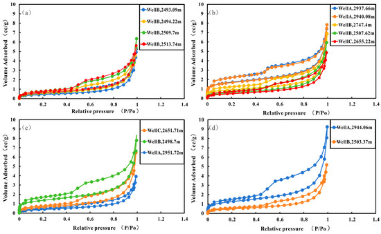LTNA is mainly used for analyzing micropores and mesopores. The LTNA curve shape reflects the partial pore size distribution within shale samples (Figure 6a). The curves for different lithofacies all exhibit an inverse “S” shape. The adsorption curve shows a slow upward trend in the low-pressure area, with a clear inflection point between relative pressures of 0.4–0.6, followed by a rapid increase in the high-pressure area. Due to variations in pore structure and morphology, the slope of the adsorption curve increases, and the saturation adsorption plateau is not well defined at high relative pressure (Figure 6b). This indicates that the desorption and adsorption curves do not overlap, resulting in a significant hysteresis loop (Figure 6c). According to the Kelvin equation, a hysteresis loop forms when capillary condensation occurs and the relative pressure (P/P0) exceeds 0.5. Based on the IUPAC classification method, the desorption curves for all four lithofacies display distinct inflection points within the relative pressure range of 0.4 to 0.6. These characteristics correspond to the H3 hysteresis loop (Figure 6d), suggesting that the pores in all four lithofacies are predominantly narrow slit-shaped and wedge-shaped pores.