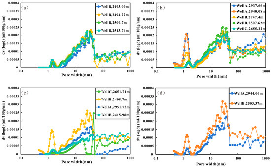 Pore size distribution curves of different lithofacies. (a) CS lithofacies. (b) CLCS lithofacies. (c) SLMS lithofacies. (d) SLCS lithofacies.