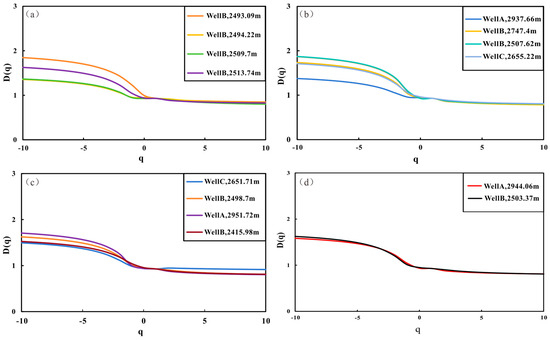 Generalized fractal dimension spectra of different lithofacies. (a) CS lithofacies. (b) CLCS lithofacies. (c) SLMS lithofacies. (d) SLCS lithofacies.