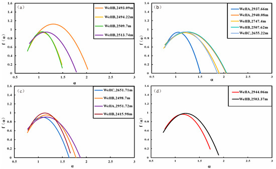Multifractal spectra of different lithofacies. (a) CS lithofacies. (b) CLCS lithofacies. (c) SLMS lithofacies. (d) SLCS lithofacies.