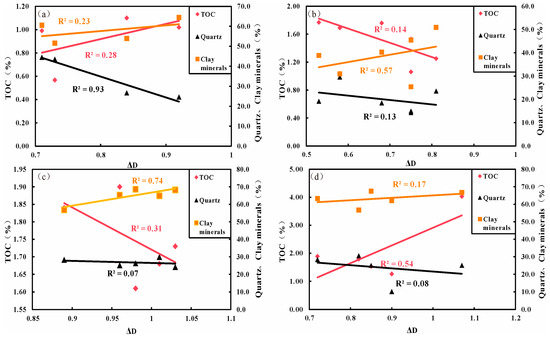 Correlation diagram between multifractal parameters of different lithofacies and mineral compositions (TOC): (a) CS. (b) CLCS. (c) SLMS. (d) SLCS.
