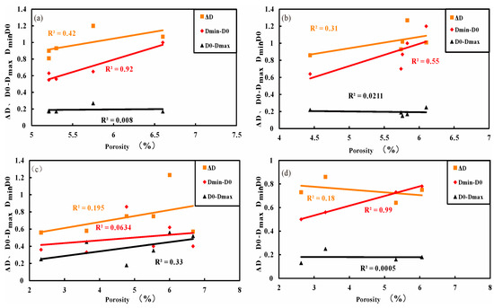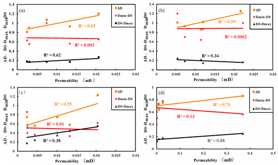 Physical parameters comprehensively reflect the shale pore system, with pore gapping and permeability being the most critical factors influencing storage capacity and flow. These properties determine reservoir quality [61]. Establishing relationships between physical properties and multifractal parameters helps in understanding the heterogenous nature of shale reservoirs. Previous studies have found that the low-probability parameter (Dmin-D0) is positively correlated with porosity, while the high-probability parameter (D0-Dmax) is negatively correlated with permeability, thus characterizing the heterogeneity of porosity and permeability [22]. The correlations between the porosity of CS, CLCS, SLCS, and (Dmin-D0) are significant (R2 = 0.92, 0.55, and 0.99) (Figure 12a,b,d). (Dmin-D0) is effective in characterizing the heterogeneity of porosity in these three lithofacies (Figure 12c). A larger (Dmin-D0) value indicates porosity heterogeneity. In contrast, (D0-Dmax) is more suitable for characterizing the heterogeneity of porosity in SLMS, where a high value represents strong heterogeneity and a low value indicates the opposite. The permeability of the four lithofacies is most correlated with (D0-Dmax) and ΔD (R2 = 0.65, 0.60, 0.55 and 0.74). The permeability of CS, SLMS, and SLCS is positively correlated with both (D0-Dmax) (R2 = 0.62, 0.34, and 0.88) (Figure 13a,c,d), while higher values indicate stronger heterogeneity in permeability. Conversely, the permeability of CLCS is negatively correlated with (D0-Dmax) (Figure 13b), with lower values indicating stronger heterogeneity in permeability.