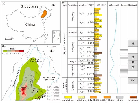- Liu, B.; Wang, H.; Fu, X.; Bai, Y.; Bai, L.; Jia, M.; He, B. Lithofacies and depositional setting of a highly prospective lacustrine shale oil succession from the Upper Cretaceous Qingshankou Formation in the Gulong sag, northern Songliao Basin, northeast China. AAPG Bull. 2019, 103, 405–432. [Google Scholar] [CrossRef]
