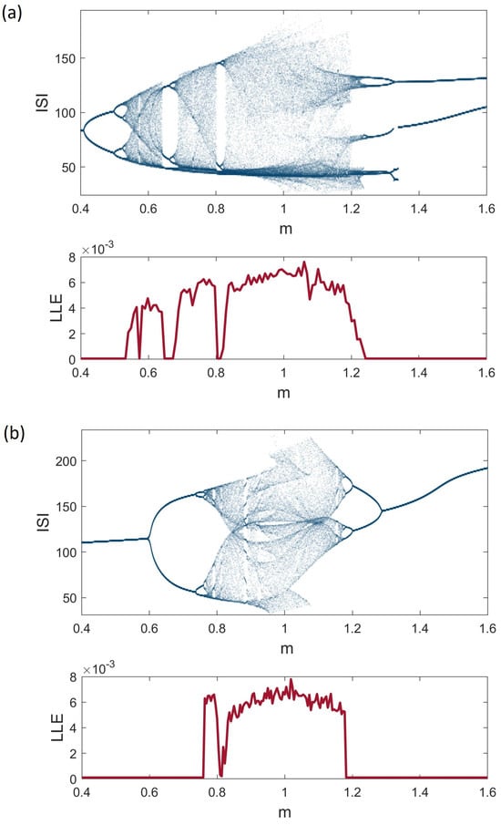 This model can generate multiple periodic and chaotic spiking and bursting dynamics as m varies. To illustrate its rich dynamics, the bifurcation diagram of the model is shown in Figure 1. The bifurcation diagrams presented in this paper illustrate the inter-spike intervals (ISI) of the neuron as specific model parameters are varied. The ISI represents the time between consecutive spikes in the neuron’s firing pattern. A spike is detected when the membrane potential x has a peak that crosses a predefined threshold value . By plotting the ISI against the changing parameter, the bifurcation diagram reveals transitions in neuronal behavior, allowing for a detailed examination of how the neuron’s firing dynamics evolve. Below each bifurcation diagram, its corresponding largest Lyapunov exponent is presented. Figure 1 illustrates that increasing m from 0.4 to 1.6 causes successive bifurcations from periodic dynamics (periodic spiking) to chaotic dynamics containing multiple periodic windows (chaotic spiking and chaotic bursting), and then again to periodic dynamics (periodic bursting).