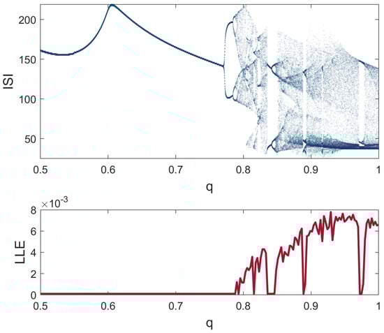 This section investigates the dynamics of the fractional-order model under different values of the fractional order and memristor strength. Figure 2 shows the bifurcation diagrams and largest Lyapunov exponent of the model for the fractional orders (Figure 2a) and (Figure 2b).