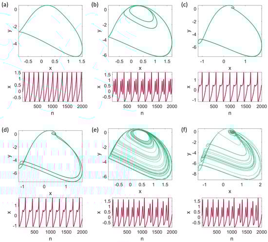 For more investigation on the effect of fractional-order, the value of m is fixed at . Figure 3 represents the bifurcation diagram according to the fractional-order q. It can be observed that by decreasing q, the dynamics remain chaotic until , although there exist some periodic windows. Figure 4 illustrates the attractors and time series of the fractional-order discrete memristive Hindmarsh-Rose (mHR) model for different values of the parameter m and the fractional order q. The upper panels display the phase portraits in the plane, while the lower panels show the corresponding time series of the variable x over discrete time steps n. Figure 4a shows periodic spiking behavior at , , characterized by regular and repetitive oscillations in the time series. Figure 4b exhibits periodic bursting at , . Figure 4c,d demonstrate a different periodic behavior, at , , and , . These patterns reveal transitions between different periodic active states in the neuron model, driven by the interplay between the fractional order and memristive feedback. In contrast, Figure 4e,f show chaotic behaviors by complex attractor structures and irregular spiking in the time domain.