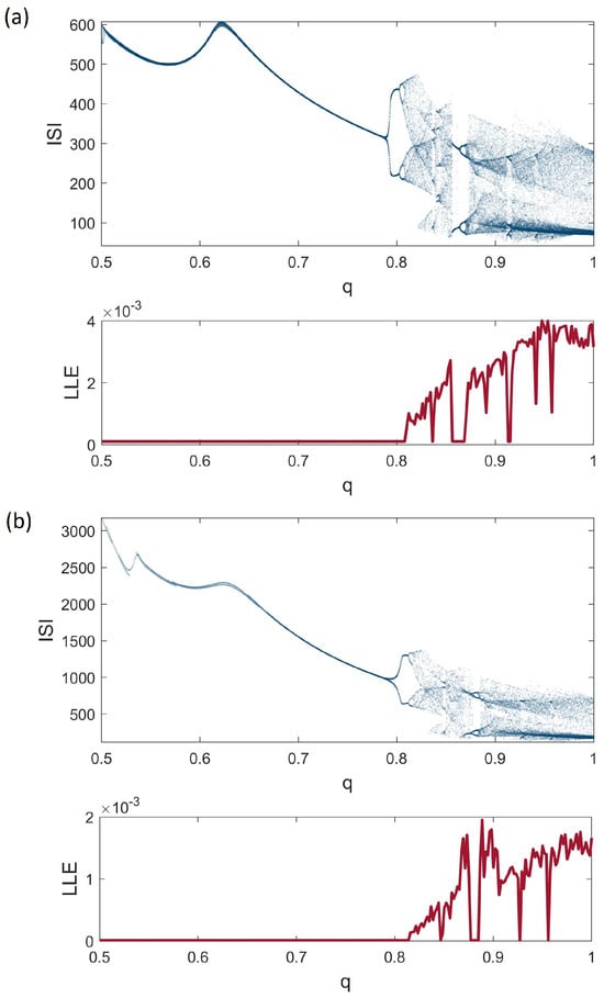 One of the other factors affecting the dynamics of the discrete mHR model is the iteration step-size used in the discretization. Figure 6 shows the effect of the discretization step size on the bifurcation diagrams relative to the fractional order. While the previous analysis used , Figure 6a uses , and Figure 6b uses . Figure 3 demonstrates that the chaotic region begins at when ; however, Figure 6 shows that when is lower, the chaotic region starts at a higher fractional order; for , and for . Additionally, another difference is in the ISI value in period-1 behavior for lower fractional orders. It can be observed that the ISI value increases as the value decreases.