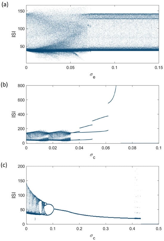 To better understand the dynamics of the coupled systems, bifurcation diagrams based on coupling strength are calculated. Figure 7a shows the bifurcation diagram of coupled systems according to the electrical coupling strength, Figure 7b refers to the inhibitory chemical coupling strength, and Figure 7c is according to the excitatory chemical coupling strength. When the coupling is electrical, the dynamics of the systems are chaotic either before synchronization () or after reaching synchronization (). For the inhibitory chemical coupling, the systems behave asynchronously and chaotically in . Then, the dynamics change to periodic. The ISI of oscillations also increases as the coupling strength grows. Finally, both systems reach a quiescent state at . In the case of excitatory chemical coupling, the neurons have chaotic behaviors in small coupling strengths. As the coupling strength increases the chaotic dynamics are transferred to the periodic dynamics through period-halving bifurcation. The periodic dynamics remain until . Then, there is a small chaotic region in , beyond which the oscillation death occurs.