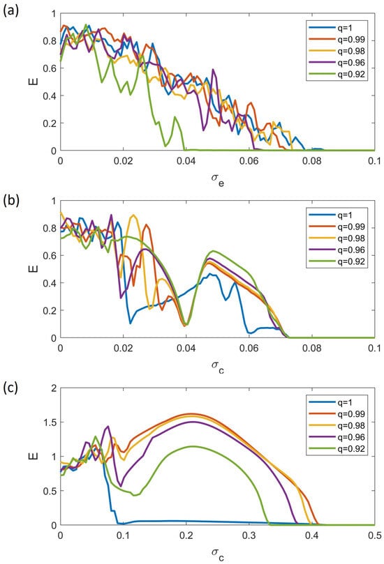 The synchronization errors of the coupled maps as a function of coupling strength for various fractional orders are shown in Figure 8. The magnetic strength is set to . Figure 8a, which refers to electrical coupling, shows that synchronization depends on the fractional order, and the coupling strength threshold decreases as the fractional order decreases. For example, at and , synchronization is achieved at , while for it is , and for it decreases to . In contrast, for inhibitory chemical coupling (Figure 8b), the synchronization error approaches zero at and is almost independent of the fractional order. However, an analysis of the system dynamics for these coupling parameters shows that the systems are not synchronized in oscillating mode but reach a common quiescent state. In Figure 8c, the synchronization error for the excitatory chemical coupling is presented. The coupling strength in which the synchronization error decays to zero is dependent on the fractional-order and decreases as the fractional-order decreases. Similar to the inhibitory coupling, the zero error shows an oscillation death of systems.