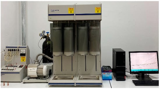 A Micromeritics ASAP 2460 BET analyzer, produced by Micromeritics Instrument Corporation in the Norcross, GA, USA, was utilized to examine the pore structure of the coal samples, as depicted in Figure 2. Among them, coal samples treated with different acid solutions were tested at least three times to strengthen the reliability of the results. The experiments aimed to measure the pore volume and structural characteristics of the coal samples before and after acidification modification. Using the obtained data, the fractal properties of the samples were determined to analyze how various organic acids influence the alteration of coal pore configurations.