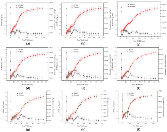 The DFT model [] is capable of analyzing pores approximately 2 nm in size and precisely forecasting capillary condensation and hysteresis effects without requiring adjustments. Based on this, this study utilizes Density Functional Theory (DFT) to analyze the pore size distribution of coal samples subjected to different acidification modifications, using low-temperature nitrogen adsorption experimental data. The pore size distribution curves and cumulative pore volume curves for coal samples under various acidification modification conditions were obtained, as shown in Figure 3.