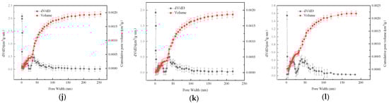 Pore size distribution of coal samples treated with different acid solutions. (a) YM; (b) SM; (c) 3%HA; (d) 5%HA; (e) 3%AA; (f) 5%AA; (g) 3%GA; (h) 5%GA; (i) 3%OA; (j) 5%OA; (k) 3%CA; (l) 5%CA.