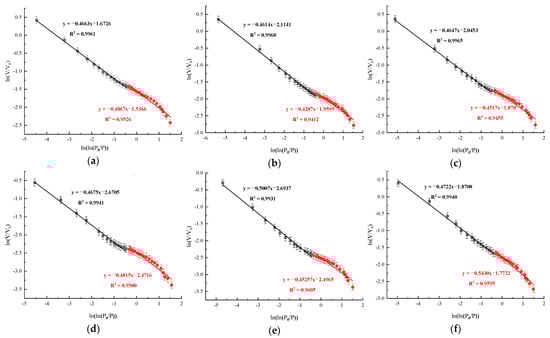 where —gas adsorption volume at equilibrium pressure , cm3/g; —intercept of the fitted curve with the y-axis, a constant; —parameters for calculating the fractal dimension; —saturated vapor pressure, MPa; —gas equilibrium pressure, MPa.
