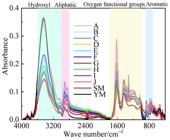 As shown in Figure 5, the results of FTIR spectra showed that the positions of the main absorption peaks of the untreated and treated coals were the same, and the overall trends of the spectra were similar. There is a significant difference in the intensity of the characteristic peaks of different coal samples, which indicates that different acid solutions will affect the content of some functional groups, while the basic structure will not be changed [].