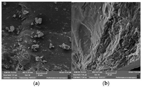 In order to further investigate the effect of acidic fracturing fluid on the pore structure of coal, scanning electron microscopy was used to test the pore surface topographic features of coal samples before and after acid solution treatment. We take the raw coal and the samples after citric acid solution treatment as examples, as shown in Figure 6a,b.