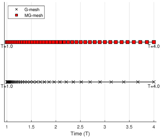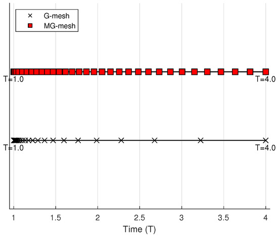 As mentioned above, Equation (8) mathematically describes the time modified graded mesh in this paper. The MG-mesh is divided into the following two distinct parts within the time interval : For indices , a nonuniform discretization is adopted, whereas for , a uniform grid is utilized. Figure 1 illustrates the time distribution of the MG-mesh compared to the conventional G-mesh (where ) for the parameters , and . Figure 2 shows the in Figure 1 is taken as 0.8 and the rest is kept constant. It can be clearly observed from the figure that the MG-mesh (8) contains more grid points than the conventional G-mesh (1) as time grows, a property that helps to reduce computational errors.