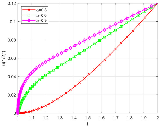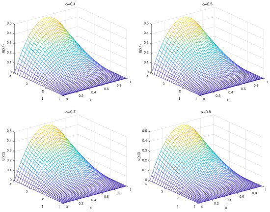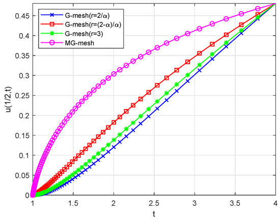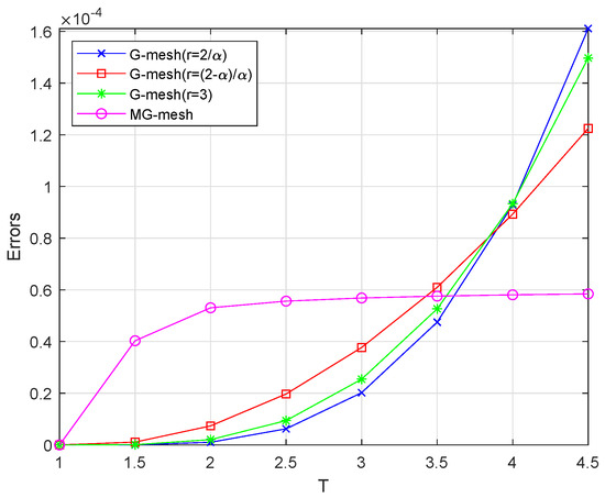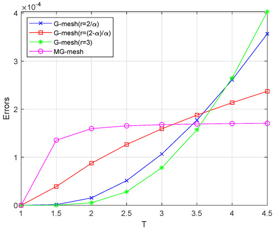For and different values of , Figure 3 visually presents the numerical solutions corresponding to various fractional orders . A detailed cross-sectional analysis at under different values is subsequently illustrated in Figure 4, while Figure 5 provides a comparative visualization of numerical solutions obtained from the MG-mesh versus standard graded meshes (G-meshes) with parameters , , and varying mesh refinement ratios r. Additionally, we compare the errors and convergence rates obtained on our proposed MG-mesh (8) with those on the optimal graded meshes (1). Our observations indicate that in these scenarios, the optimal global rates of convergence of are achieved. Moreover, as time T increases, the errors decrease. Notably, the errors calculated on the MG-mesh are significantly smaller than those on graded meshes for each given time length T. Figure 6 and Figure 7, respectively, demonstrate the variation of errors as time progresses.