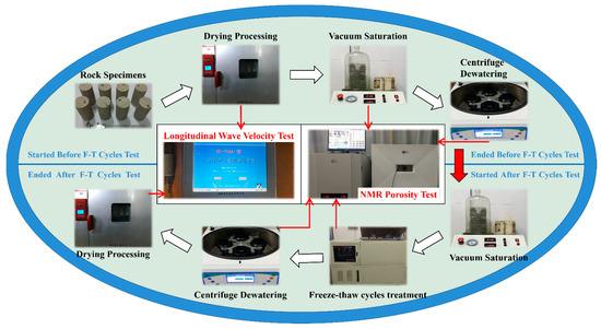 - The sandstone specimens, after centrifugation, were placed in a vacuum-drying oven for drying treatment. After drying the sandstone specimens, the LWV of the sandstone after the freeze–thaw cycles was measured using the HS-YS4A rock acoustic wave detector. The overall experimental procedure is illustrated in Figure 1.