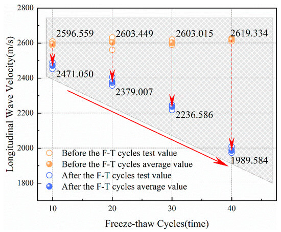 Longitudinal wave velocity of sandstone before and after freeze–thaw cycles.