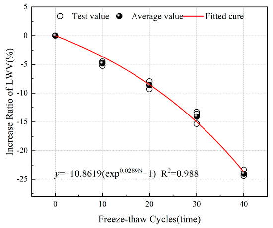 where represents the LWV growth rate (%), denotes the LWV of the sandstone before the freeze–thaw cycles (m/s), and is the LWV of the sandstone after the freeze–thaw cycles (m/s).