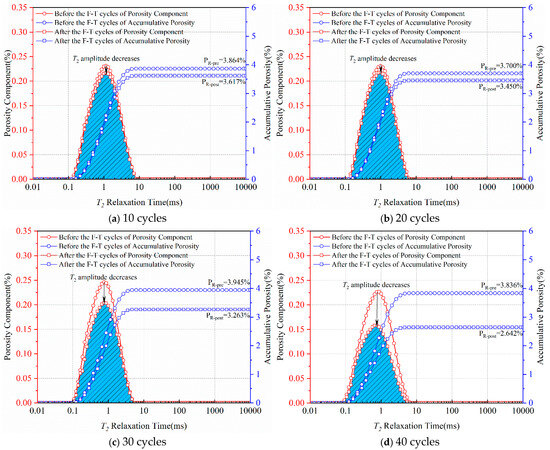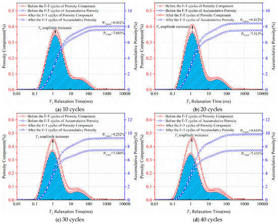 Figure 4 illustrates the typical T2 spectrum distribution curves of sandstone subjected to 10, 20, 30, and 40 freeze–thaw cycles under water-saturated conditions. It can be observed from Figure 4 that the amplitude of the T2 spectrum distribution curves and the cumulative T2 spectrum curves of sandstone under saturated conditions increases after the freeze–thaw cycles. Moreover, with the increase in the number of freeze–thaw cycles, the area of the T2 spectrum distribution curves and the amplitude of the cumulative T2 spectrum curves of sandstone under water-saturated conditions increase significantly, reflecting the increase in the total porosity of sandstone with the increase in the number of freeze–thaw cycles.
