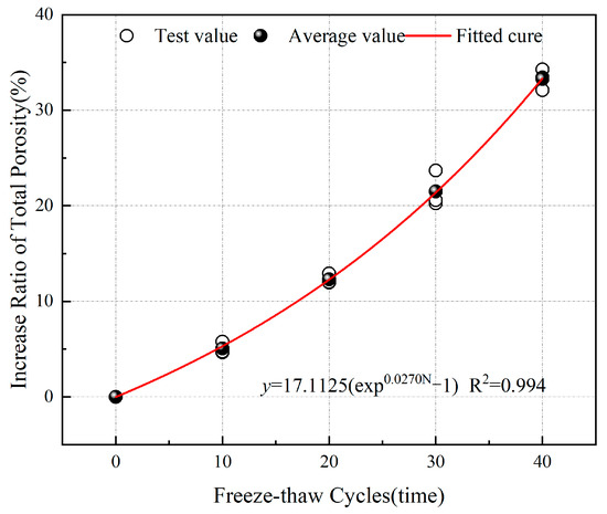 Relationship between the growth rate of total porosity and the number of freeze–thaw cycles.