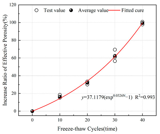 Relationship between the growth rate of effective porosity and the number of freeze–thaw cycles.