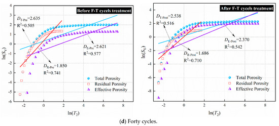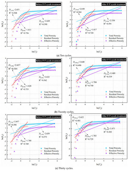 According to Equation (18), the NMR fractal dimensions obtained by linear fitting of the T2 spectrum test data of sandstone before and after freeze–thaw cycles in a water-saturated state are denoted as the total porosity fractal dimensions and ; the NMR fractal dimensions obtained by linear fitting of the T2 spectrum test data of sandstone before and after freeze–thaw cycles in a centrifuged state are denoted as the residual porosity fractal dimensions and ; and the NMR fractal dimensions obtained by linear fitting of the difference between the T2 spectrum test data of sandstone before and after freeze–thaw cycles in a water-saturated and centrifuged state are denoted as the effective porosity fractal dimensions and . The fractal dimensions of sandstone subjected to different numbers of freeze–thaw cycles are shown in Table 4. According to fractal geometry theory, the NMR fractal dimensions of the internal pore structure of sandstone are between 2 and 3. From the NMR fractal dimension calculation graph in Figure 12, it can be observed that the NMR fractal dimensions of the total porosity and effective porosity of sandstone before and after the freeze–thaw cycles are between 2 and 3, with the correlation coefficients all greater than 0.500. However, the fractal dimensions of residual porosity are all less than 2, indicating that the total porosity and effective porosity of sandstone before and after freeze–thaw cycles exhibit geometric fractal characteristics, while the residual porosity does not exhibit obvious geometric fractal characteristics.