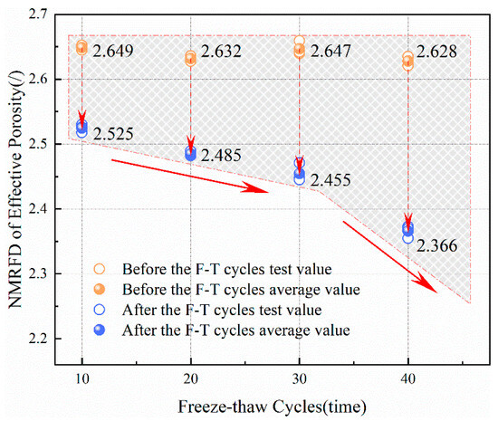The changes in the NMR fractal dimensions of the total porosity and effective porosity of sandstone before and after freeze–thaw cycles are shown in Figure 13 and Figure 14, respectively. As indicated by Figure 13 and Figure 14, with the increase in the number of freeze–thaw cycles, the decrease in the NMR fractal dimensions of the total porosity and effective porosity of sandstone is more significant compared to before the freeze–thaw cycles, indicating that freeze–thaw cycles lead to an increase in micro-cracks and micro-pores inside the sandstone, which gradually connect with each other.