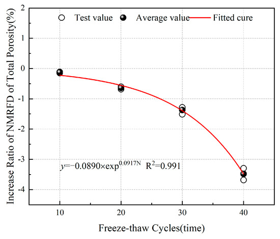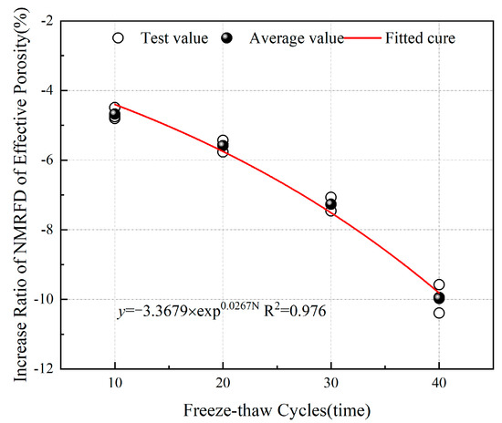 Based on the NMR fractal dimensions in Table 4, the growth rates of the NMR fractal dimensions of total porosity and effective porosity of sandstone subjected to freeze–thaw cycles can be obtained. According to Figure 15 and Figure 16, after undergoing 10, 20, 30, and 40 freeze–thaw cycles, the growth rates of the NMR fractal dimension of total porosity were −0.126%, −0.642%, −1.371%, and −3.484% respectively, while the growth rates of the NMR fractal dimension of effective porosity were −4.682%, −5.585%, −7.267%, and −9.969% respectively. Throughout the entire freeze–thaw cycle process, the growth rate of the NMR fractal dimensions of effective porosity was consistently lower than that of total porosity. Fitting the experimental data revealed that the growth rates of the NMR fractal dimensions of total porosity and effective porosity exhibited an exponentially decreasing relationship with the number of freeze–thaw cycles. According to fractal geometry theory, the magnitude of the fractal dimension reflects the complexity of the pore structure, with a smaller fractal dimension indicating weaker heterogeneity of pore distribution and more uniform distribution of pores inside the sandstone. This indicates that, after undergoing freeze–thaw cycles, the internal pores of the sandstone connect with each other, the heterogeneity of the pore structure gradually weakens, and the pore connectivity improves.