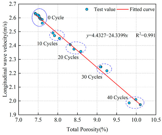 The porosity of rocks can quantitatively describe the distribution of micro-cracks and micro-pores inside the rock, while the LWV is mainly influenced by the micro-cracks and micro-pores inside the rock. Therefore, a correlation analysis can be conducted between the porosity and LWV of sandstone. Based on the condition and properties of the sandstone, the formula (where represents porosity, and and are coefficients determined based on experimental data) is used for correlation analysis, as shown in Figure 17. From Figure 17, it can be observed that the total porosity of sandstone is linearly negatively correlated with the LWV, with a correlation coefficient of 0.991. Sandstone without undergoing freeze–thaw cycles has smaller porosity and higher velocity, as shown in the upper left of Figure 17. After undergoing different numbers of freeze–thaw cycles, the porosity of the sandstone increases, and the velocity decreases, gradually moving towards the lower right of Figure 17. It can be seen that after undergoing different numbers of freeze–thaw cycles, sandstone develops numerous defects, such as micro-cracks and micro-pores, due to the freeze–thaw cycles, resulting in an increase in porosity and a decrease in LWV.