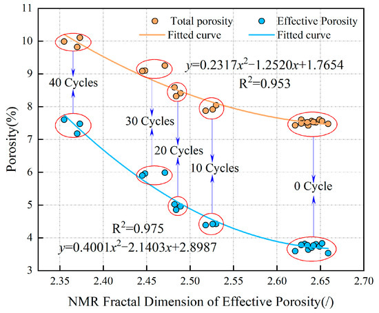 Relationship between NMR fractal dimension of effective porosity and number of freeze–thaw cycles.