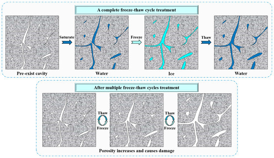 As a natural geological material, rocks always contain various micro-defects, such as micro-cracks and micro-pores [1]. Under freeze–thaw cycles, water inside these micro-defects repeatedly freezes and thaws [2,3]. When the temperature drops below the freezing point of the water inside the micro-defects, freezing occurs. During the freezing process, water continuously migrates to the freezing front and crystallizes into ice lenses, generating frost heave force [4]. Once the frost heave force reaches the threshold required for the expansion of the micro-defects, they undergo expansion [5,6,7]. Conversely, when the temperature rises above the freezing point of the water inside the micro-defects, the frozen water melts, releasing frost heave force and causing water migration [8,9,10]. This repeated freeze–thaw cycle process continuously expands the micro-defects inside the rocks [11,12,13]. To elucidate the evolution of micro-defects inside rocks subjected to freeze–thaw cycles, numerous scholars have employed various detection methods to observe and analyze the micro-defects inside rocks subjected to freeze–thaw cycles.