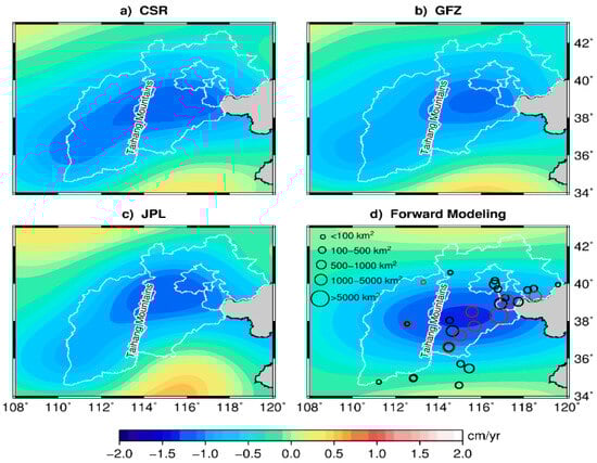 Figure 1 illustrates that all GRACE data sources (a–c) consistently indicate that the shallow groundwater depression cones in North China are predominantly located in the alluvial fans at the piedmont of the Taihang Mountains, while the deep groundwater depression cones are primarily situated in the central Hebei Plain. Additionally, Figure 1d demonstrates that the forward modeling results are in agreement with the GRACE observations. In Figure 1d, the red circles denote the deep groundwater depression cones and the black circles represent the shallow groundwater depression cones. The rate of groundwater depletion in North China based on GRACE was 2.2 ± 0.3 cm/yr from 2003 to 2010, equivalent to an annual loss of 8.3 ± 1.1 km3 of water.