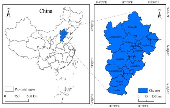 The North China Plain has cumulatively over-exploited more than 180 billion cubic meters of groundwater. The cumulative over-exploitation in the Beijing–Tianjin–Hebei Plain area is more than 150 billion cubic meters, which accounts for approximately five-sixths of the GOE in North China. The water resources in the three provinces and cities account for only 0.7% of the national total water resources, but carry 8% of the national population and 10% of the total national economic volume. The area and volume of over-exploitation account for about 37% of the country, indicating a kind of predatory exploitation []. Cao et al. found that the number of groundwater depression funnels formed in the Beijing–Tianjin–Hebei region has reached 31, forming a large group of groundwater cones of depression []. The Beijing–Tianjin–Hebei region serves as China’s capital economic hub and a globally critical groundwater crisis convergence zone. Deep confined aquifers exhibit millennial-scale recharge cycles, where water table decline caused by over-exploitation has permanently disrupted natural flow fields. Shallow cones of depression trigger soil desiccation and land subsidence [], while deep groundwater depression cones induce bedrock stress imbalances. The above analyses indicate that the Beijing–Tianjin–Hebei region is the most serious GOE area in the North China Plain. The surrounding provinces of Shanxi and Shandong exhibit less severe over-exploitation compared to the three provinces and cities; moreover, reliable datasets from these areas are also difficult to acquire. Therefore, this paper selects the Beijing–Tianjin–Hebei region as the subject if research to represent the world’s largest groundwater depression cone. For clarity, the geographic location of the study area is shown in Figure 2.